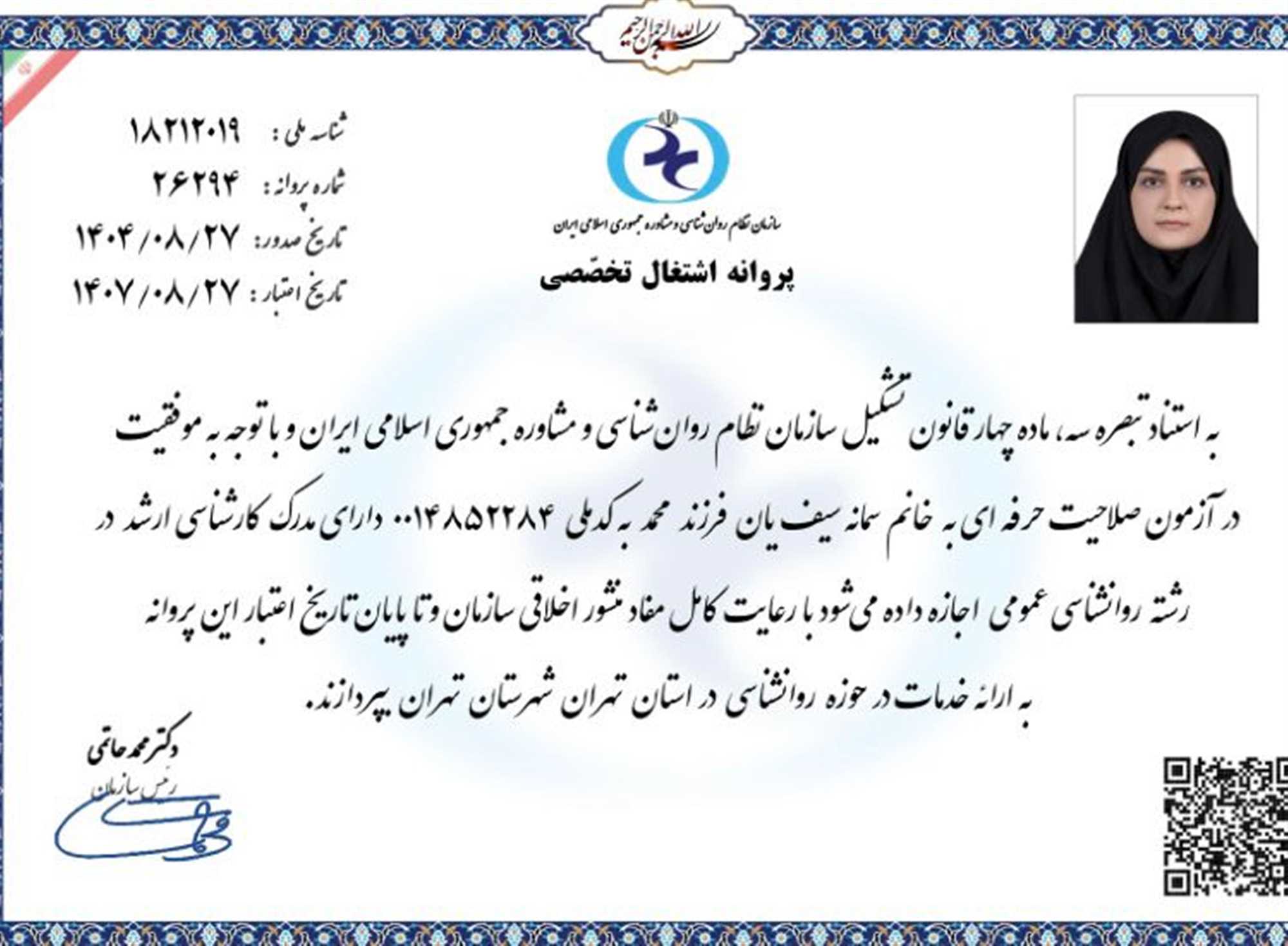 عضو سازمان نظام روان شناسی دارای پروانه اشتغال از سازمان نظام روانشناسی